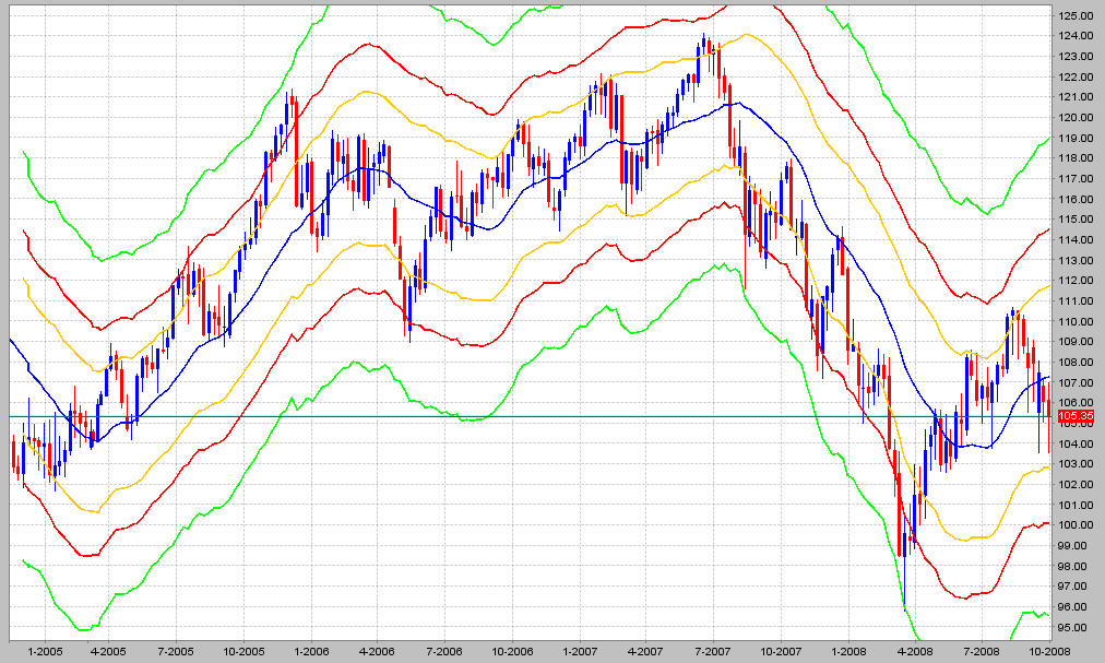 一定期間(一般的に20日)の移動平均線の上下にそれぞれ3本の標準偏差のラインを加えたもので、このラインに挟まれた部分をバンドと呼び、価格の大半がこのバンドに収まるという統計学を応用したものです。